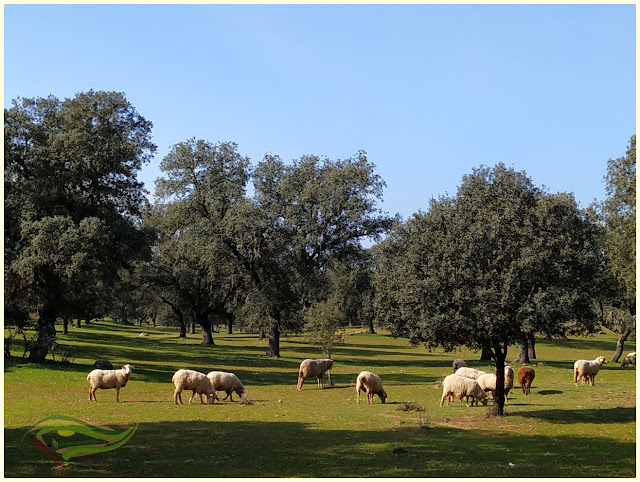 Nosotros realizamos esta ruta en el mes de marzo y coincide con que hay multitud de rebaños de ovejas con pequeños corderitos por todas partes por esas fechas, tened en cuenta si la realizáis en las mismas fechas, un detalle a este respecto, mas allá de lo adorables que puedan llegar a ser los corderos recién nacidos, pensad que allá donde hay un rebaño con ovejas hay un perro mastín guardándolas, puede que vosotros no lo veáis al principio, pero él o ella a vosotros si os ha visto y está midiendo la distancia de seguridad que tienen sus ovejas con respecto a vosotros, bastará que avancéis mas de lo necesario hacia el rebaño, para fotografiar los lindos corderitos o intentar tocarlos como si de un peluche se tratara, para que os sorprendan unos ladridos amenazadores y un gran bulto por lo general blanco o gris que se dirige hacia vuestra dirección a galope tendido. ¡No os asustéis!, ¡No salgáis corriendo!, bastará con retroceder lentamente y seguir vuestro camino evitando mirarlo directamente, cuando os hayáis alejado lo suficiente volverá a sus quehaceres bajo una sombra de una encina.